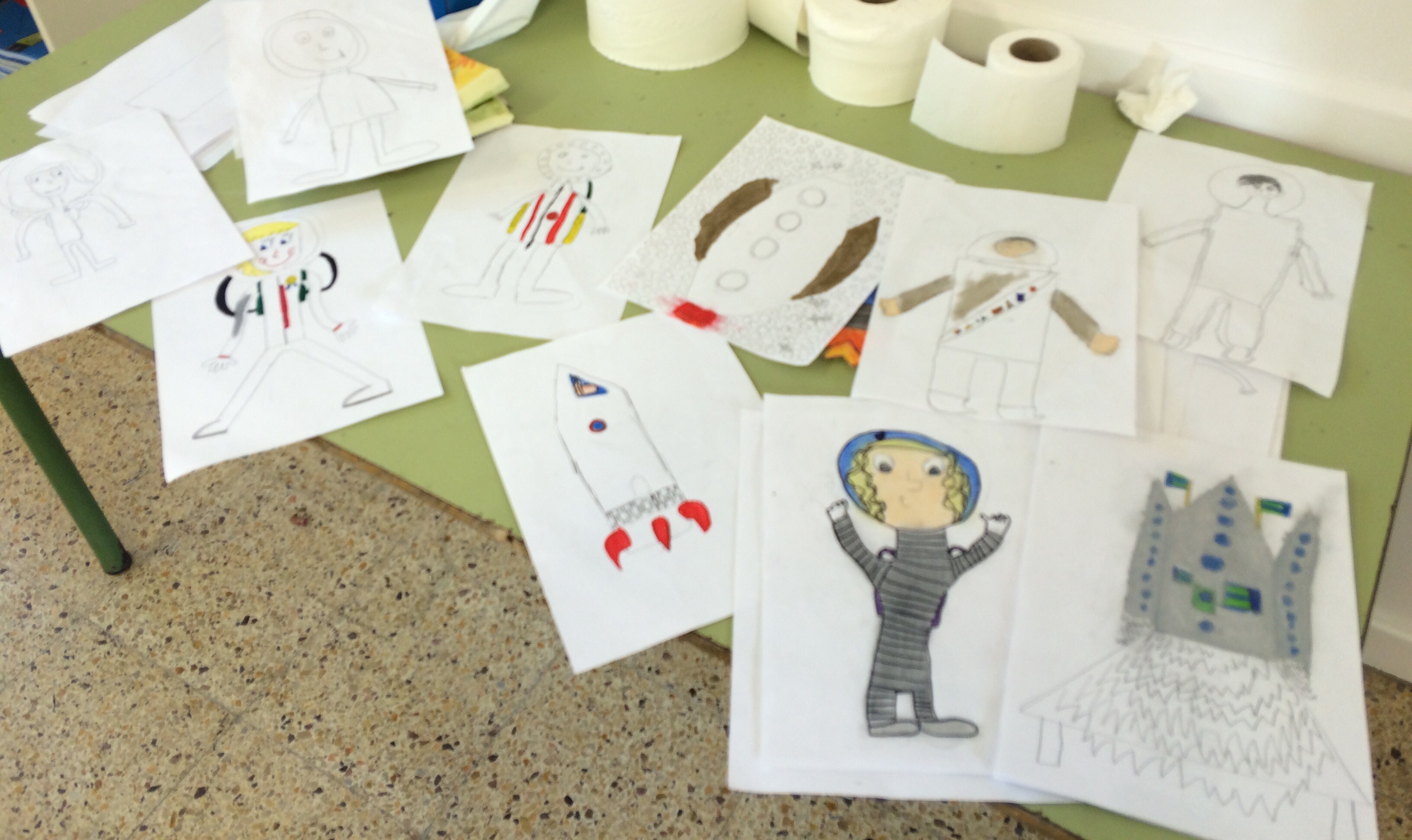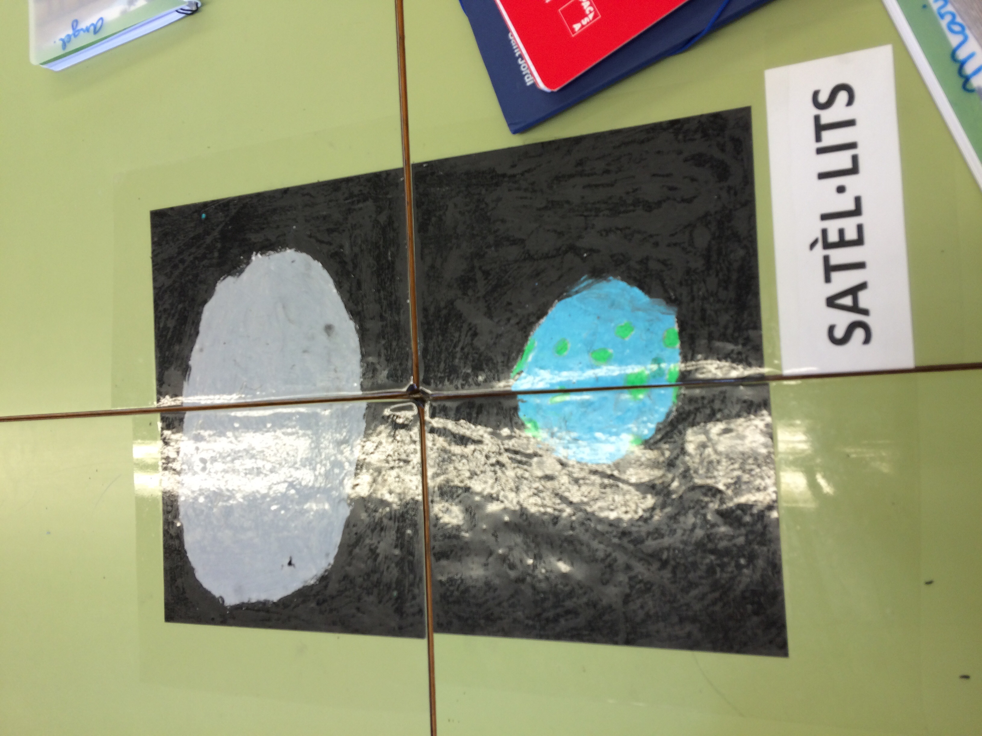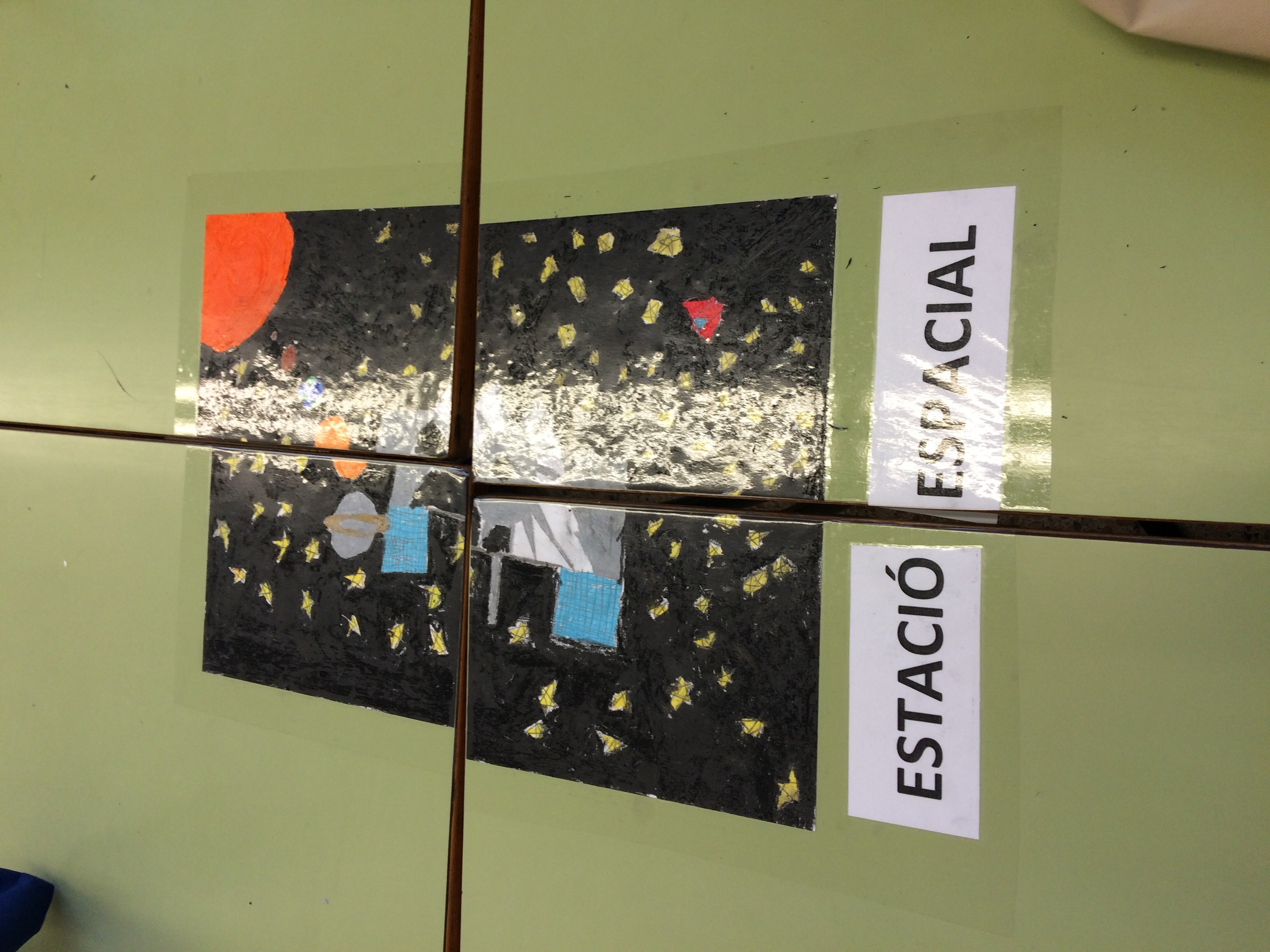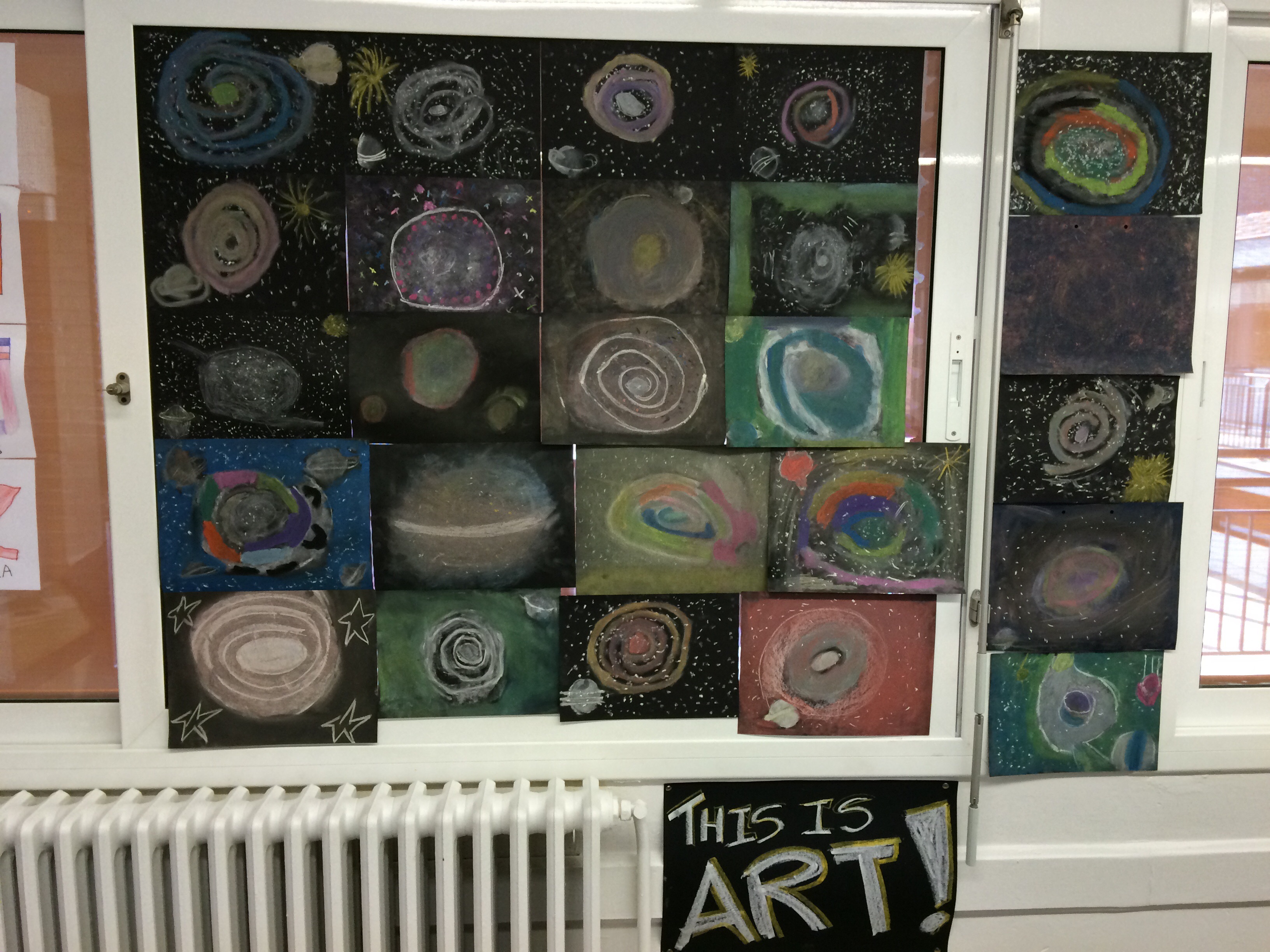 Com ja sabeu, estem gaudint de la Plàstica en anglès amb la Roser cada divendres tarda. D’acord amb el nom de la clase, les Galàxies, hem cobert el soste de l’aula amb multitud de galàxies fetes amb guixos.