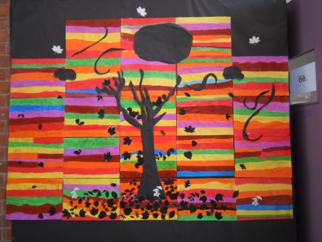 Hem retallat unes figures de paper molt boniques, hem utilitzat uns papers en blanc pintats amb ceres per fer el paisatge i per acabar hem retallat un arbre gran de paper negre i l´hem enganxat.