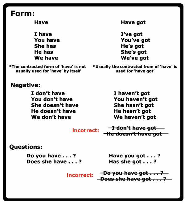 In this session we will work on the grammar construction I + HAVE + GOT / I + HAVEN’T + GOT as a tool in physical descriptions.