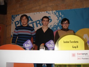 El dia 8 de febrer els alumnes de 3r van anar a enregistrar un programa del concurs Picalletres, que va ser emès el dia 19 d’abril. Per raons alienes al centre i, excepcionalment, per al plantejament del programa, els dos equips del nostre institut es van enfrontar entre ells.