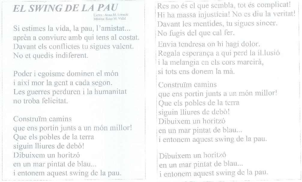 Swing de la Pau [Lletra: Ana M. Lorente; Música: Rosa M. Vidal] Publicat el 7 de novembre de 2014 per jcanet6 Respon http://blocs.xtec.cat/tromrumba/files/2014/11/3r-Swing-de-la-pau.mp3 http://blocs.xtec.cat/tromrumba/files/2014/11/3r-Swing-de-la-pau-instrumental.mp3