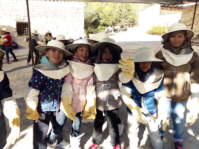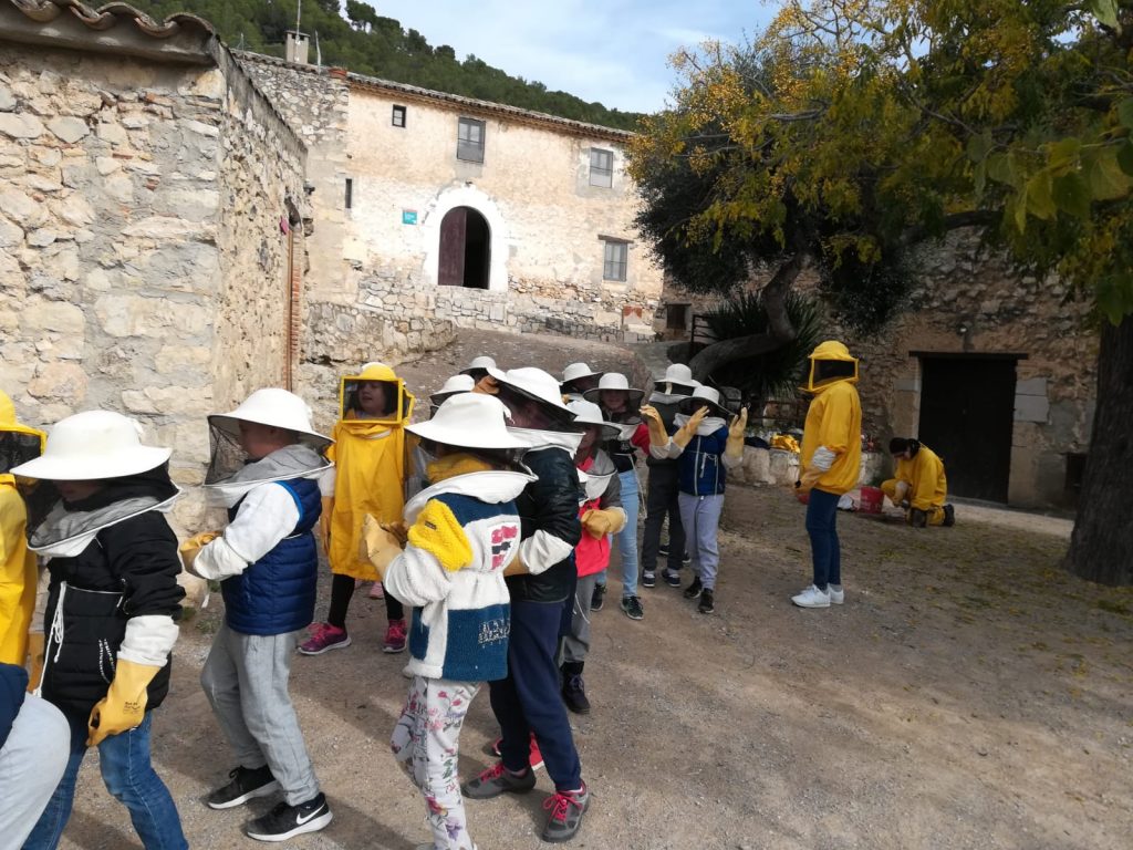 La careta i els guants són sens dubte dos dels elements bàsics de protecció de l’apicultor. Nosaltres avui a Can Pere ens els hem posat mentre hem descobert aspectes de les abelles de la mel. Hem après també, com les persones podem interactuar amb elles i com elles ens ajuden a obtenir productes diferents.