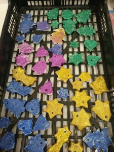 És molt senzill! Posem el bicarbonat de sodi a la safata (la quantitat que volem treballar), i poc a poc anem afegint l’aigua amb la gerra. No cal afegir molt sinó quedaria aigualit. Amb molt poc n’hi ha prou. La textura ens ha de permetre jugar amb els motlles com si fos neu real. És una massa no tòxica, i per tant, és segura per treballar amb tot l’alumnat. Podem afegir la variable de treballar amb glaçons que es van desfent a poc a poc, en lloc de l’aigua.