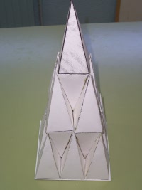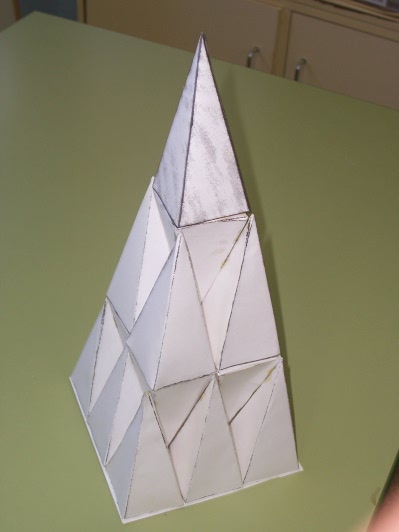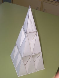 Aquesta piràmide de paper està feta ajuntant-ne un grapat de les que vam fer a l’últim taller. Serieu capaços d’esbrinar quantes piràmides petites han calgut per fer-ne aquesta de gran?