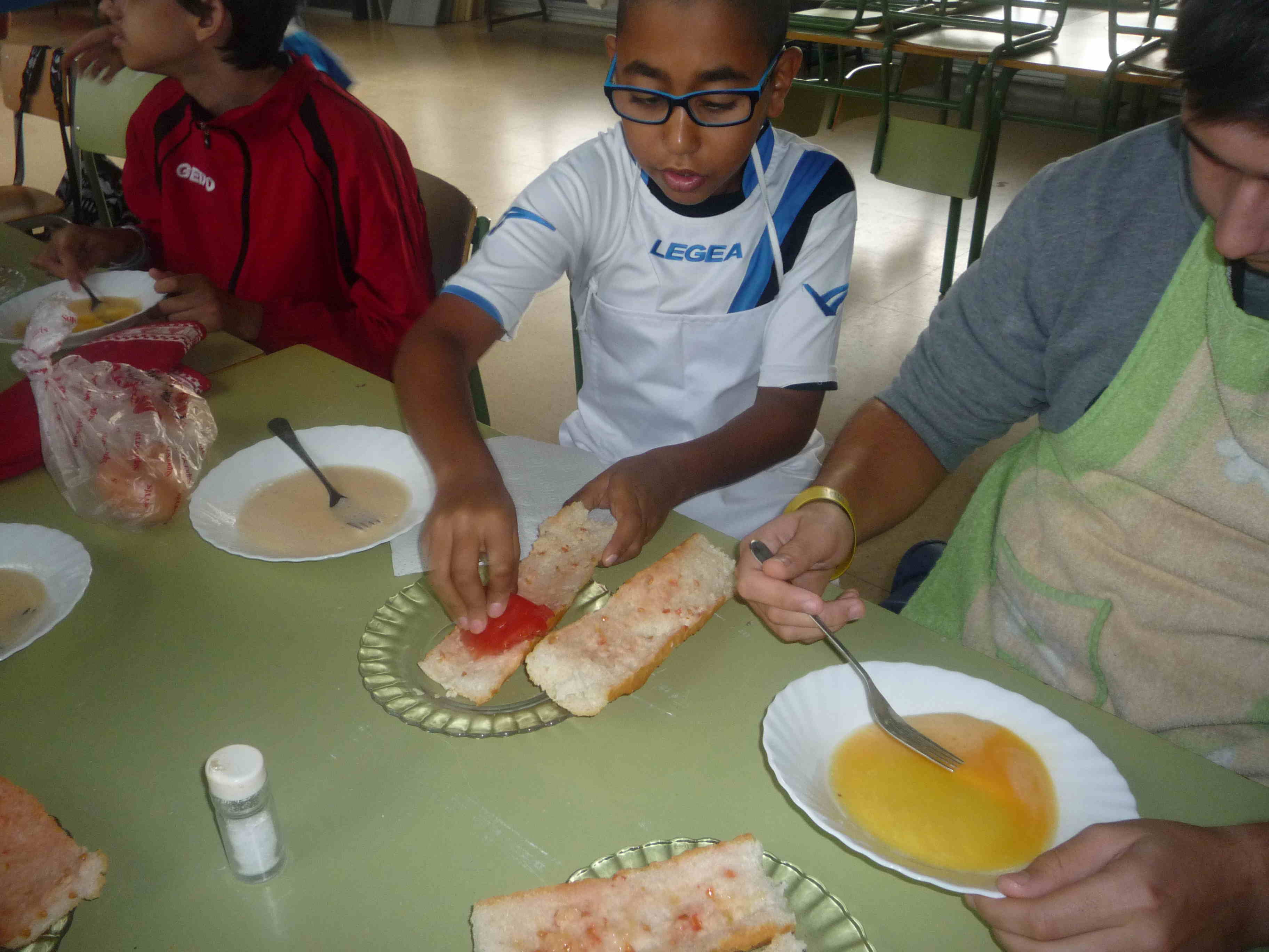 2.  partim el pa, suquem amb tomàquet i posem oli i sal