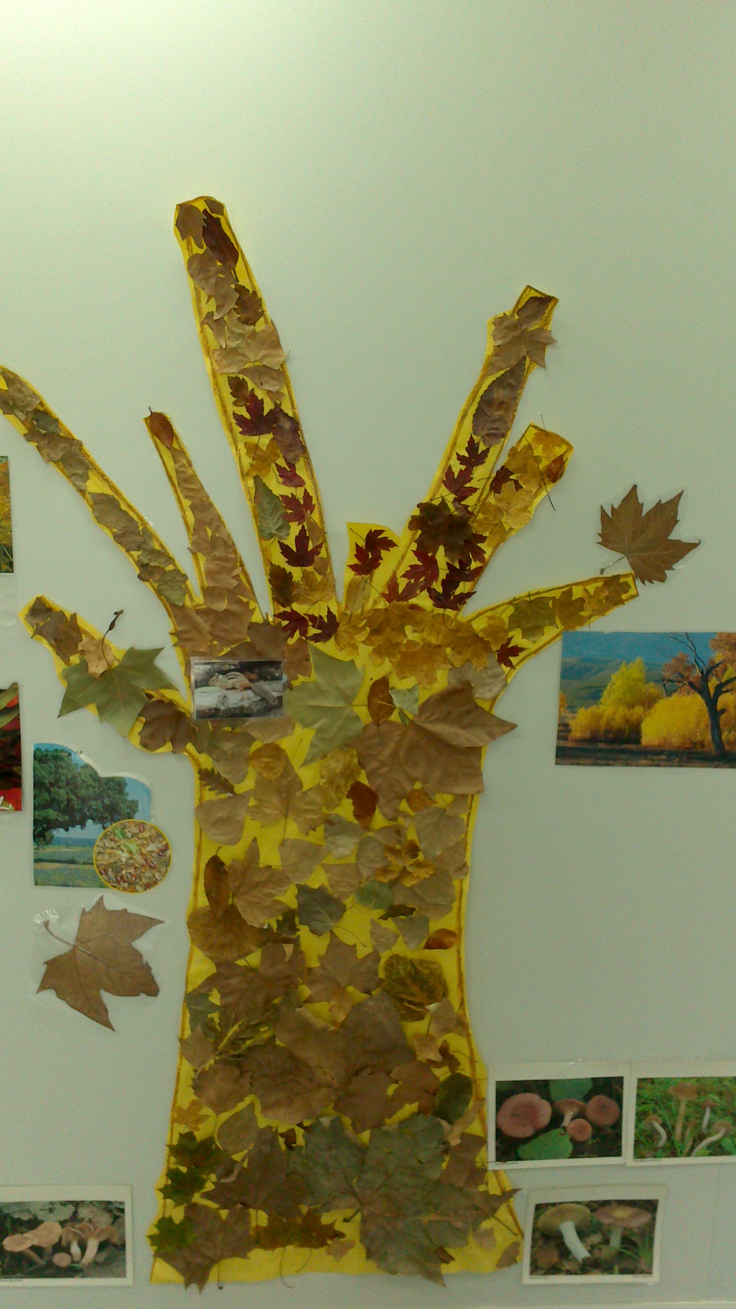 L’arbre està fet amb fulles de diferents colors (grocs, taronges, vermells…), mides, textures,…