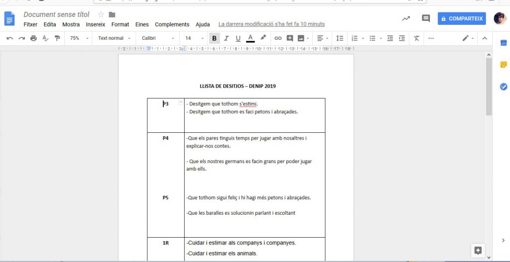 Per confegir aquest manifest es compartirá un document en xarxa, on hi havia una graella on cada classe escriu el seu desitg. En aquest cas s’ha emprat l’aplicació google drive amb un document de text compartit
