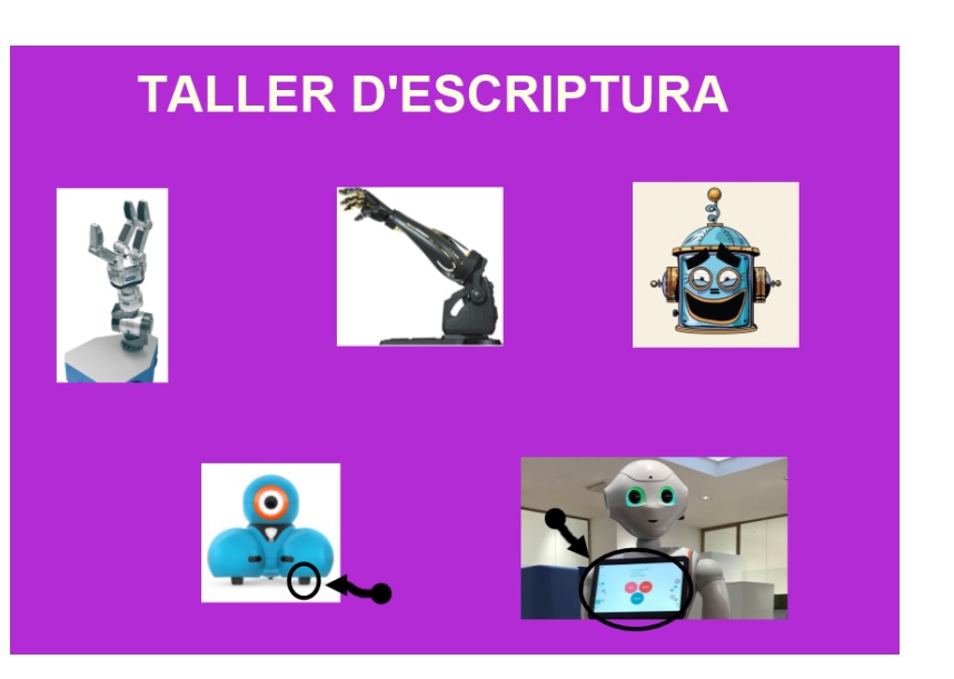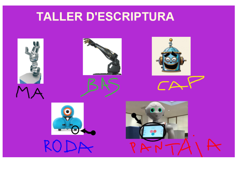 La mestra ha dissenyat una fitxa amb diferents parts dels robots que hauran de treballar i escriure conjuntament a la PDI.