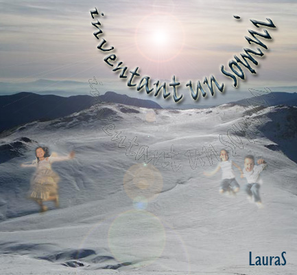 En la segona proposta el somni és més evident es representa per les imatges de nens saltant i jugant sobre la neu. Els nens queden borrosos, difuminats, perquè es reforci la idea de somni, de fictici, d’imaginari. En aquesta imatge el sol està creat també artificialment però com una brillantor, i al voltant d’aquest, s’arquegen les lletres del títol iniciant una espiral incipient, també per reforçar la sensació de transport a un món irreal, onejant, volàtil…