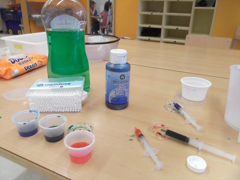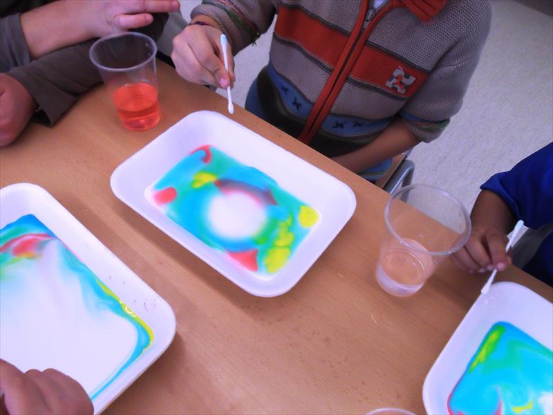 En una safata amb llet, posem colorant alimentari amb una xeringa. Agafem un bastonet mullat en sabó i toquem molt suaument el colorant i … la taca de colorant s’escampa i visualment queda màgic. “Una imagen vale más que mil palabres”.