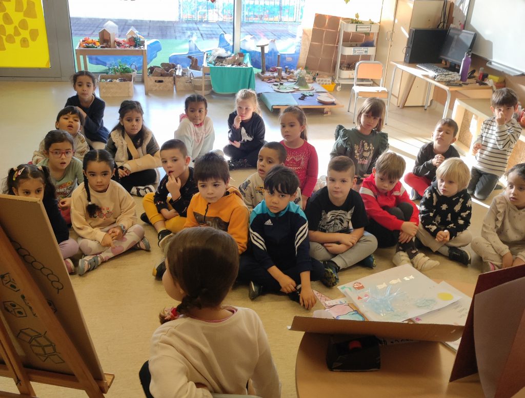 Van començar amb un conte, que explicava que un dia, Joan Miró es fa amic d’una serpentina de color negre que es converteix en un camí per descobrir nous mons… A partir de la proposta artística es van anar endinsant en els universos de Joan Miró i van viatjar tots plegats cap als planetes dels colors.