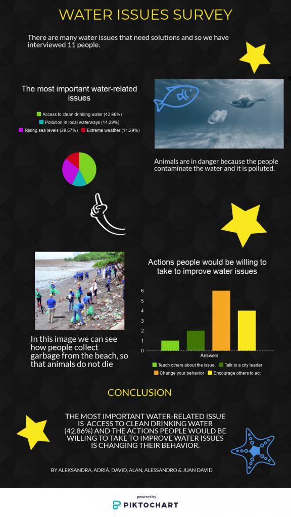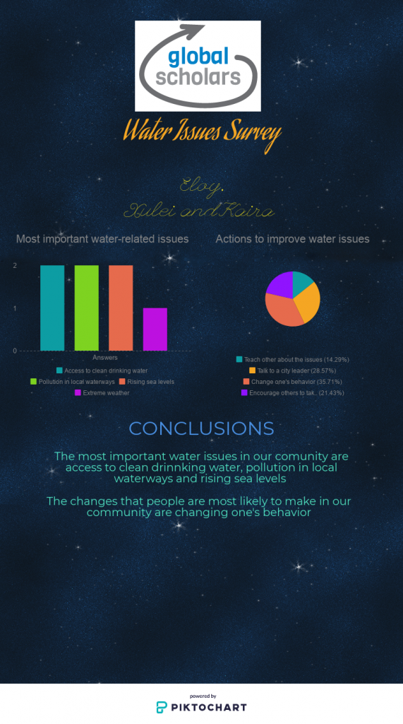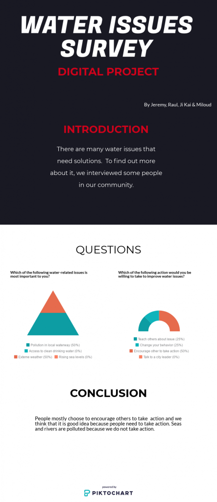 In the Water Issues Survey digital project, you will survey members of the community to learn about the water issues that are most important to them and the actions they would take to address the issue. Then, you will create an infographic to share your findings and reflections.