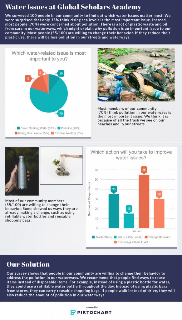 In the Water Issues Survey digital project, students will survey members of the community to learn about the water issues that are most important to them and the actions they would take to address the issue. Then, students will create an infographic to share their findings and reflections. The resources on this page will help students brainstorm, create, and share their work with Global Scholars peers.