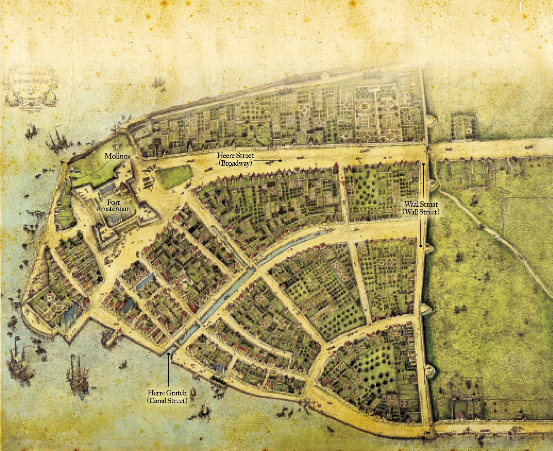 En els primers anys del segle XVII es van fundar a la costa est d’Amèrica del Nord nombroses colònies europees: d’anglesos, presents des de 1607 en Jamestown (Virgínia), d’holandesos i, una mica més tard, el 1634, fins i tot suecs. Els holandesos van arribar a Amèrica seguint el rastre d’un navegant anglès, Henry Hudson. El 1613, una expedició holandesa remuntava el Hudson i l’any següent es fundava Fort Orange, avui Albany, capital de l’Estat de Nova York. Era un lloc dedicat a comerciar amb els indígenes de la zona, amb articles com pells-de llúdriga, visó i castor-, tabac, productes agrícoles i, més endavant, també armes.