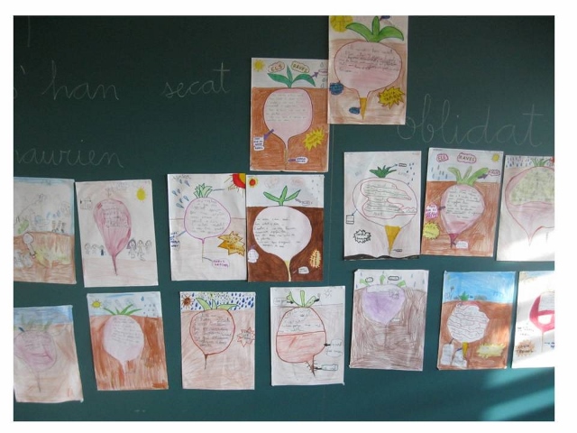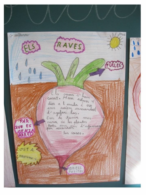Després, de manera individual, cadascú ha anat fent un esquema amb la forma d’un rave per tal d’explicar tota l’experiència (recollida dels raves, coneixement apresos, reflexions sobre el que cal fer per tenir cura de les plantes…).