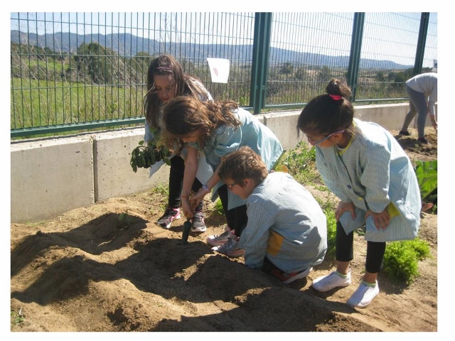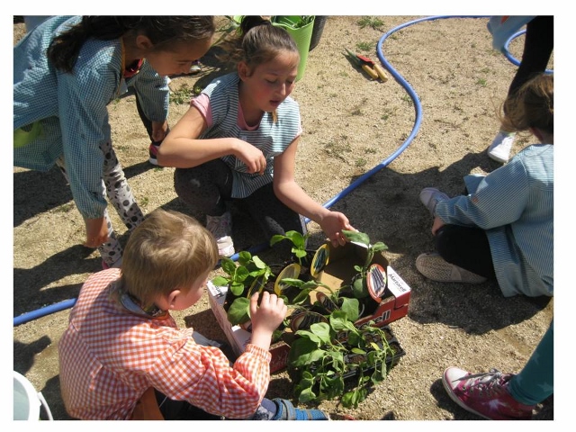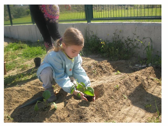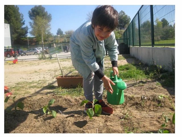Quan ja tenim l’espai net i amb l’ajut d’una aixada preparem la terra per poder plantar les albergínies. Aleshores, per torn, les anem traient del test i plantant (recordem primer la manera de fer-ho i després ho fan de manera autònoma). Finalment reguem i acordem que caldrà estar més atents que el trimestre passat i baixar més sovint a regar i mirar com estan les plantes.
