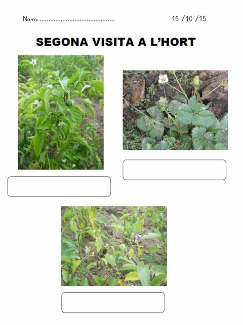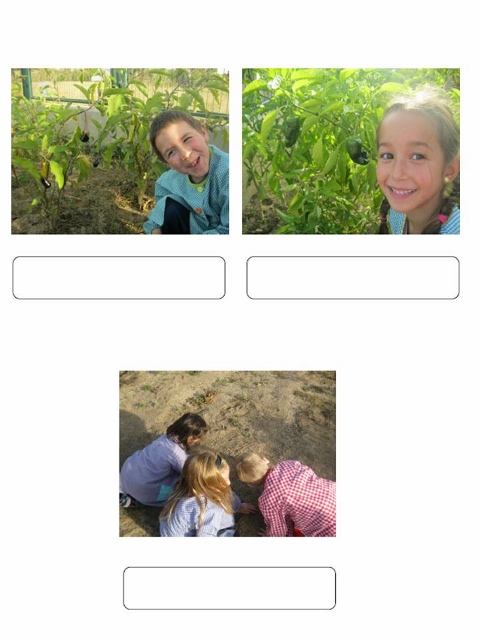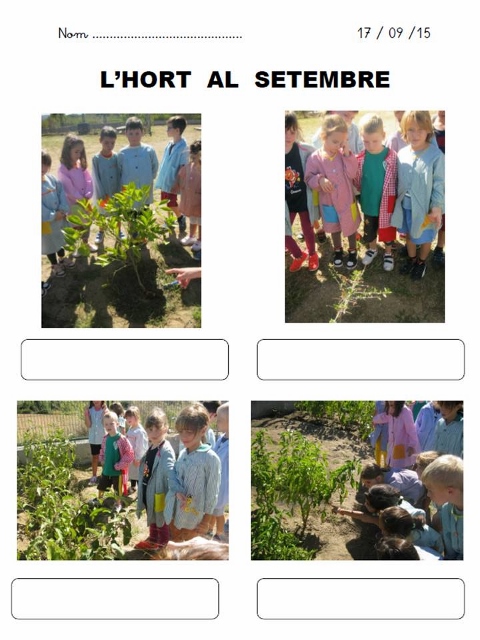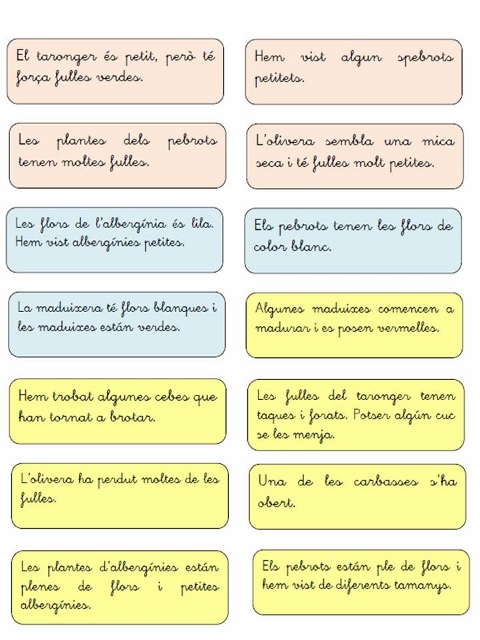 Volem veure si els alumnes són capaços de recordar el que hem anat fent a l’hort  i alhora treballar una mica la lectura de frases. Els proposem que retallin unes frases i les enganxin com a peu de foto de les imatges de les visites a l’hort (les frases de cada visita estan pintades amb colors diferents).