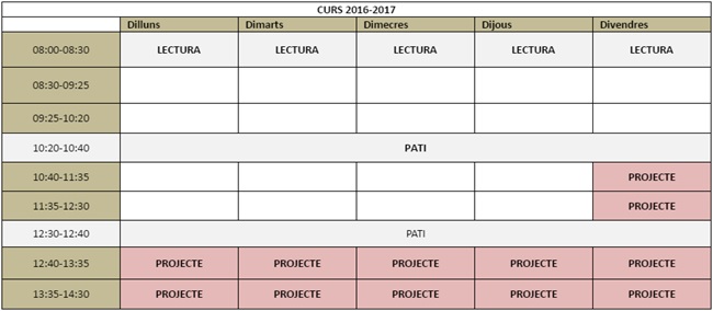 • Som 8 matèries les que en formem part: 2 h de Socials, 2 h d’Experimentals, 1 h de Matemàtiques, 1 h de Tecnologia, 1 h de Música, 2h de Català, 1 h de Castellà i 1h de Visual i plàstica.