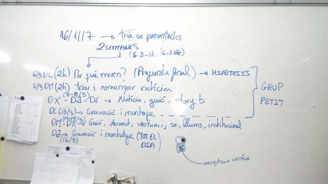 Un cop els grups tenien les notícies gravades, s’inicia la preparació del telenotícies amb tot el grup classe. Es distribueixen les diferents feines entre tots els grups (caracterització, guió, ordre notícies, attrezzo, so, llums, chroma, etc) i es du a terme la gravació col.laborativa final del telenotícies.