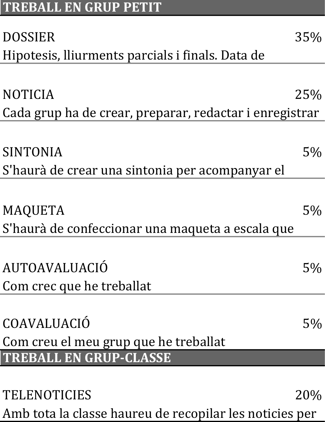Respecte al treball amb grup analitzarem les rúbriques d’autoavaluació i coavaluació.