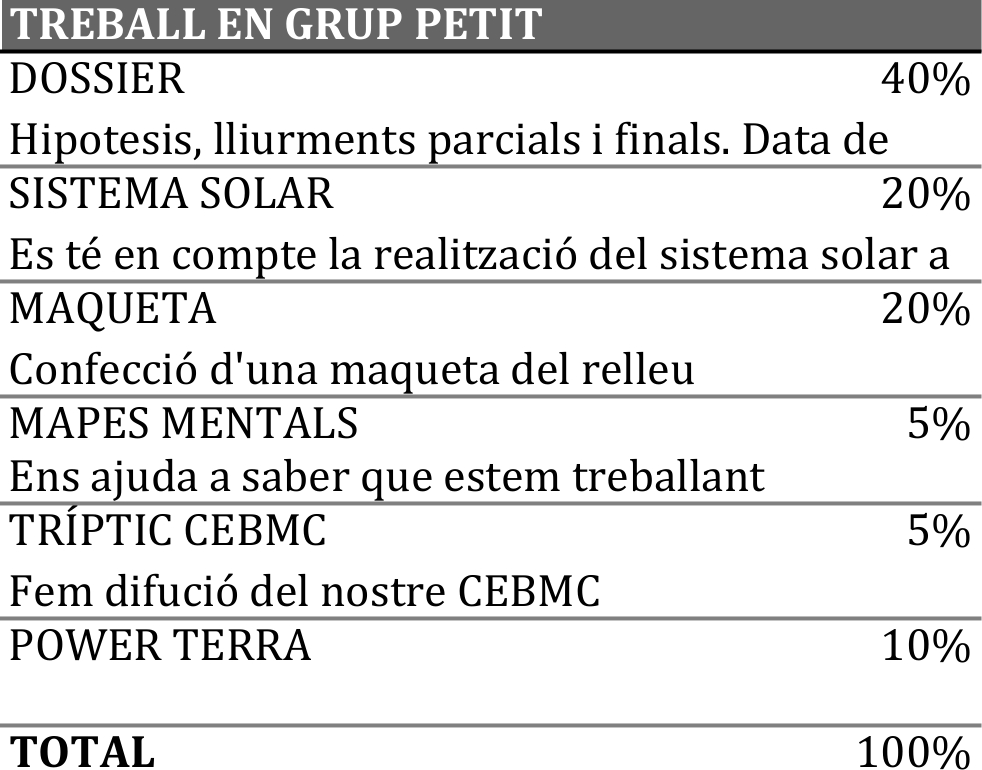 S’avaluarà el dossier de cada fase i els productes que se’n derivin (tríptic, maqueta, representacions a escala del sistema solar, mapes mentals… ) i el producte final.