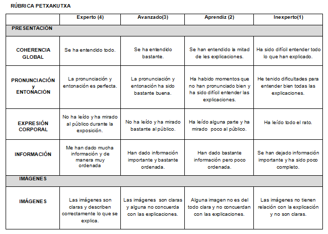 Els alumnes, en grups de quatre, escullen un tema de dins el projecte que s’ha treballat i elaboren un Petxa Kutxa (Power point de 20 diapositives explicades en vint minuts) que explicaran, fent una síntesi, als alumnes del curs inferior.