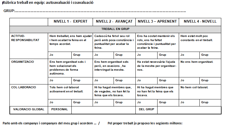 Un cop acabada l’activitat, els equips cooperatius, s’autoavaluen, a través d’una rúbrica el treball en grup que anteriorment s’ha presentat.