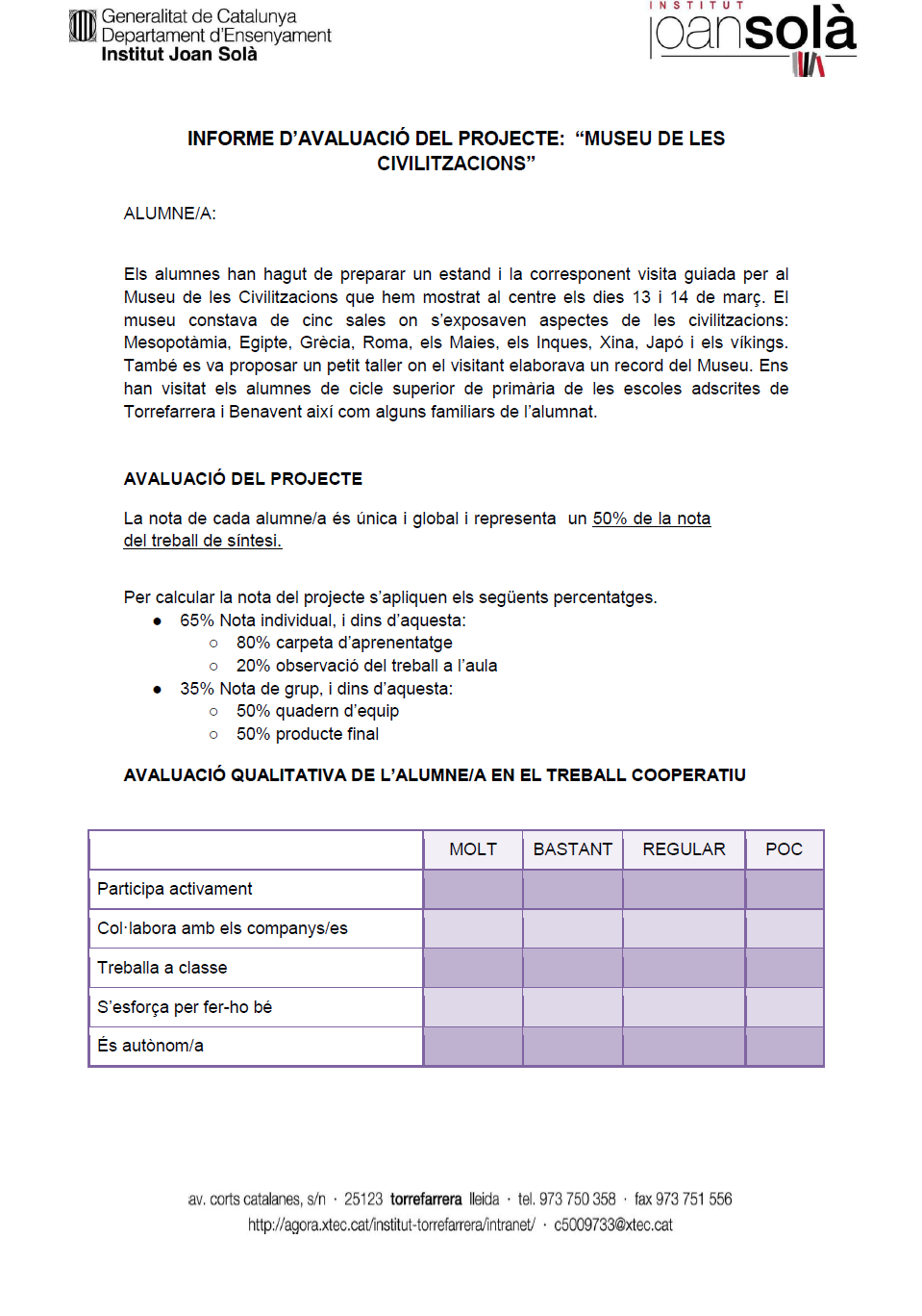 És un document individual, que s’ha d’entregar el darrer dia del projecte, al professor/a que tingueu a l’aula.