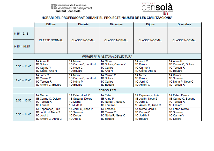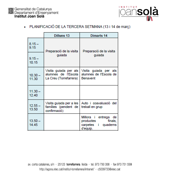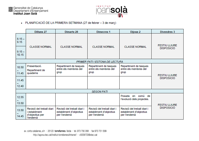 Després del projecte de 3r d’ESO ens vam adonar que la dedicació de tot l’horari a les activitats que havien de planificar els mateixos alumnes podia arribar a ser excessiva ja que vam observar que al final del matí els alumnes estaven molt cansats. Per aquesta raó vam decidir decicar-hi les quatre darreres hores.