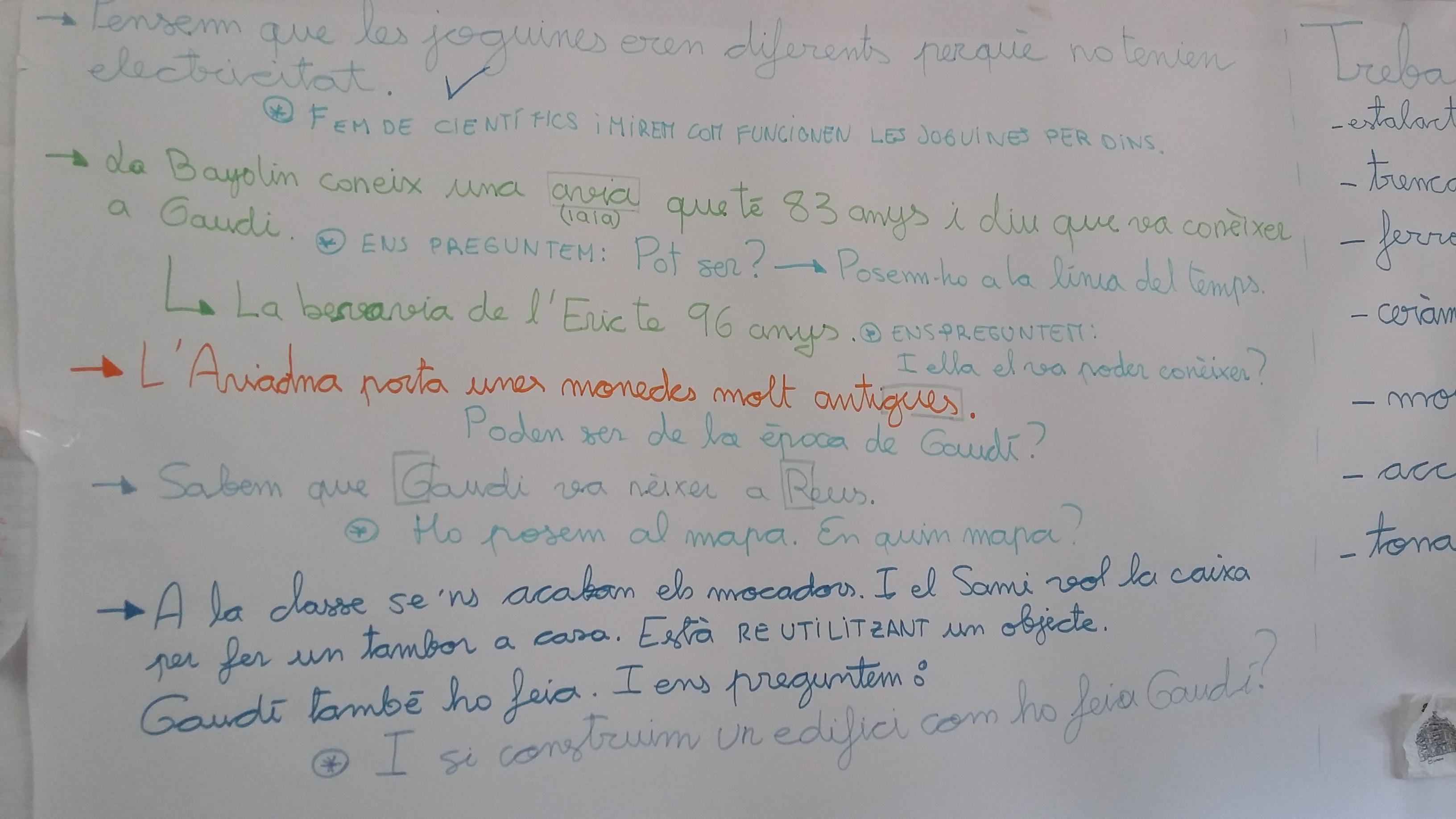 El mural és una peça molt important del seguiment del projecte. En ell es recull la informació que coneixem i els dubtes que se’ns van creant. A les diferents sessions et vas referint a ell i es miren aquells dubtes ja resolts, els que falta per resoldre i s’apunta com ho podem fer i les noves aportacions.