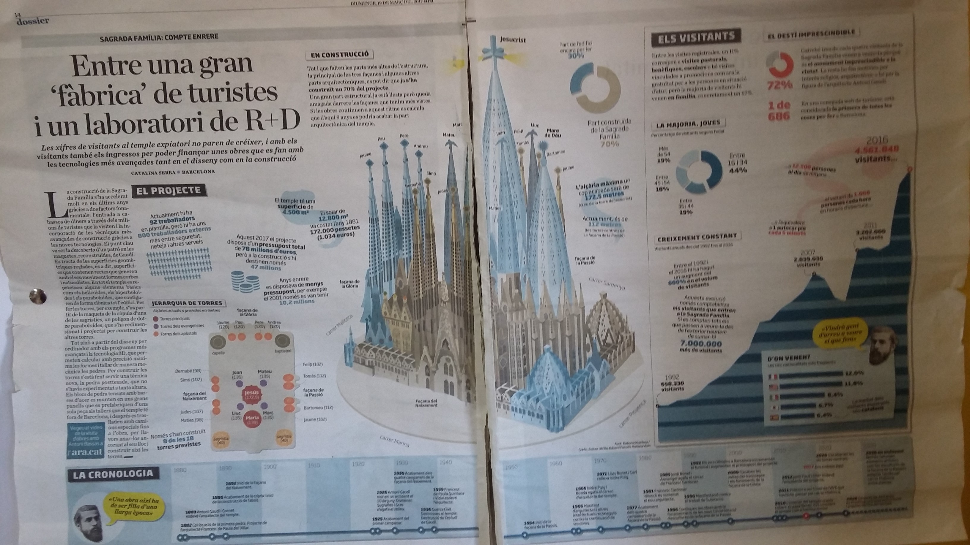 Llavors mirem la noticia, la llegim i parla de les mateixes coses que ells havien investigat durant el projecte: la mida de les torres de la Sagrada Família, hi ha una línia del temps sobre l’evolució de les obres, fins i tot parla de les nacionalitats de les persones que la venen a veure i les ordenen de més visites a menys.