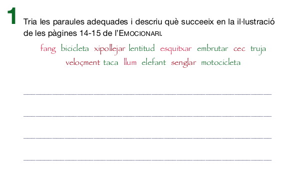 Es parteix de l’exploració d’una imatge a nivell oral que es fa el dilluns a les 8 del matí. És una sessió on les vivències del cap de setmana o d’altres moments ajuden a poder relacionar l’emoció treballada amb la  pròpia experiència vital. Al llarg de la setmana, s’aprofiten dues sessions de llengua catalana per aprofundir en l’emoció del dilluns.