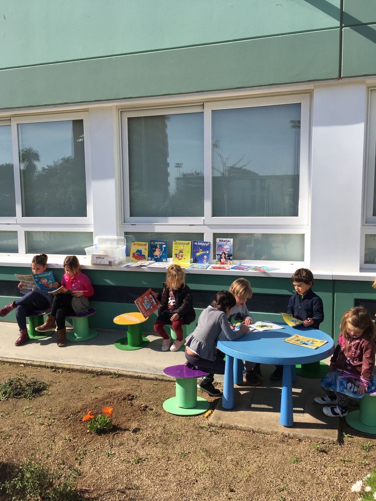 Els espais més ombrejats del pati (el porxo) hi tenim unes taules i unes grades on se situen els jocs de taula, o els tallers de creació de collarets i polseres. També tenim un racó dedicat a la lectura de revistes i còmics, en el que els nens i les nenes poden seure en tamborets. D’altra banda, l’espai de sorra i la pista estan més dedicats al jocs de moviment o d’equip. A més a més, el pati d’infantil disposa, també d’un espai ombrejat amb diferents propostes (materials per fer construccions, materials naturals,…) i el sorral.