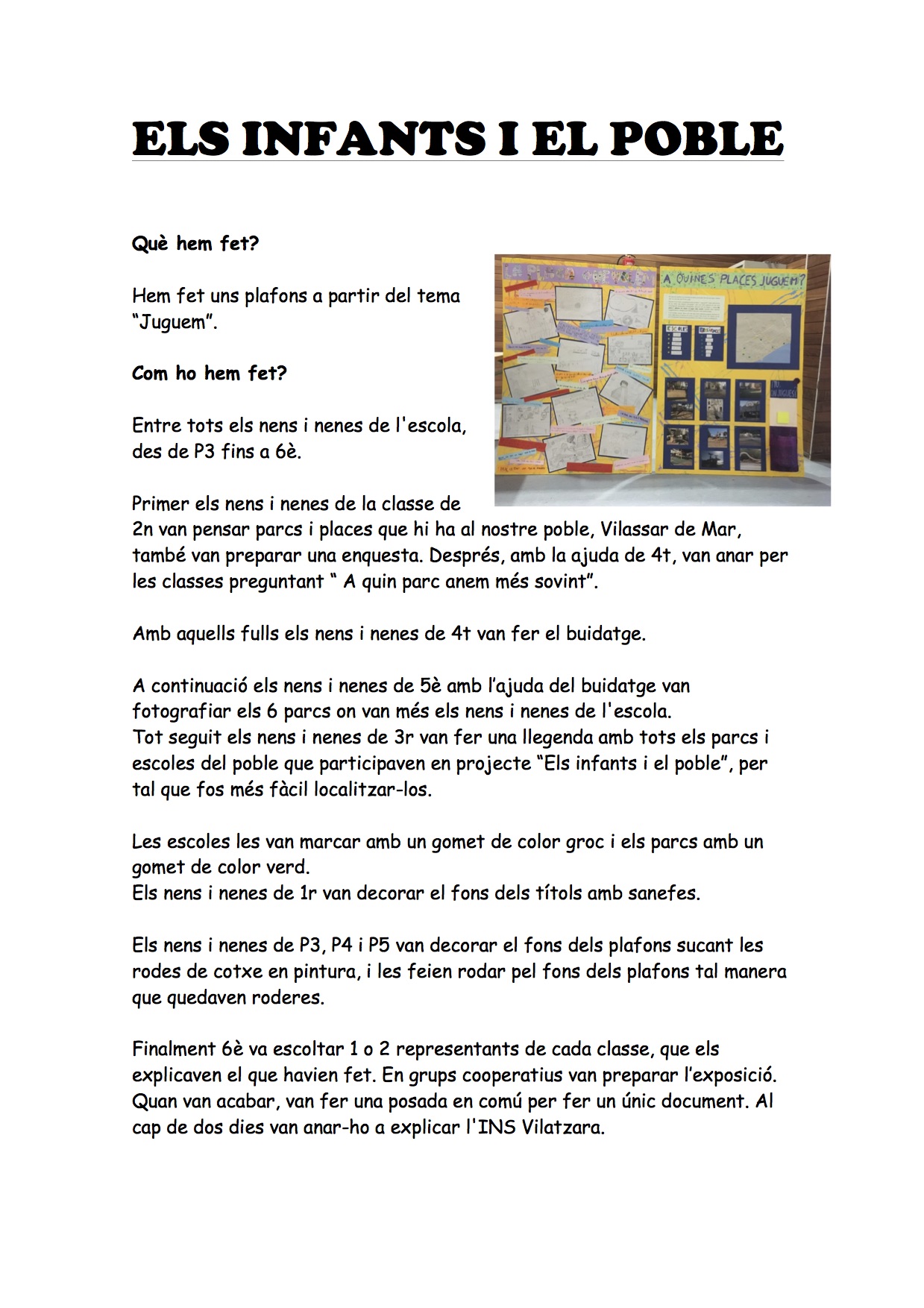 Enguany cada centre implicat havia de fer una activitat relacionada amb els infants i el poble. A l’escola ens ha tocat ser els primers i “construir” les primeres pàgines d’aquest llibre. Com que ja treballàvem el joc com a tema del curs, vam decidir que la nostra intervenció estaria relacionada amb el joc, els infants i el poble. Així doncs, entre tots els grups del centre es van realitzar un seguit d’activitats i de forma col·laborativa vam elaborar les primeres pàgines d’aquest llibre gegant.