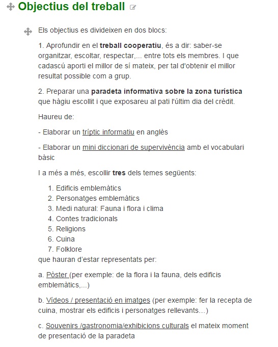 Enguany, ens hem proposat que totes aquelles qüestions, tècniques, …que podrien aparèixer per primera vegada al projecte, les treballin anteriorment en treballs concrets de les assignatures, per tal d’arribar al projecte amb una certa pràctica. Per això, per exemple, els alumnes de 2n d’ESO ja han treballat el format tríptic a les classes d’anglès.