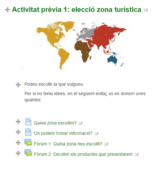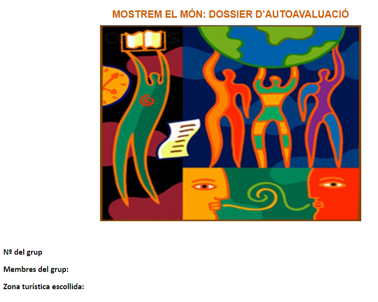 • Títol: encara per definir. El títol inicial era “Fira de les cultures del món”, però ens va semblar més motivador per l’alumnat poder triar “zones turístiques”. Per això tenim altres idees de títols com “Mostrant el món”, o “No t’ho perdis, no et perdis!”