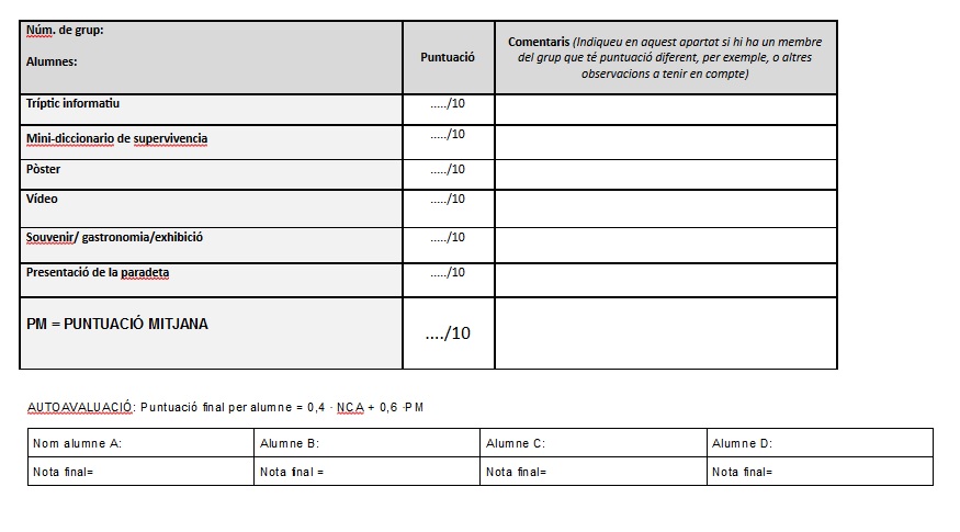 també hauran d’autoavaluar-se de tots els productes que cal que elaborin. Tindran unes rúbriques d’avaluació de cadascuna d’aquestes activitats, tant pel que fa al contingut com a la forma.
