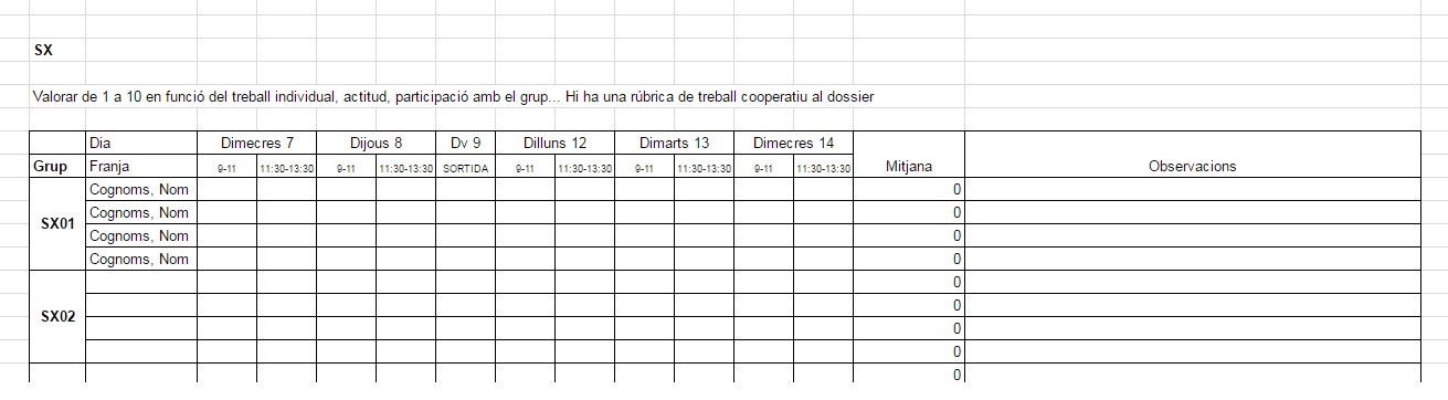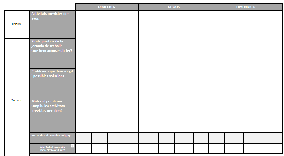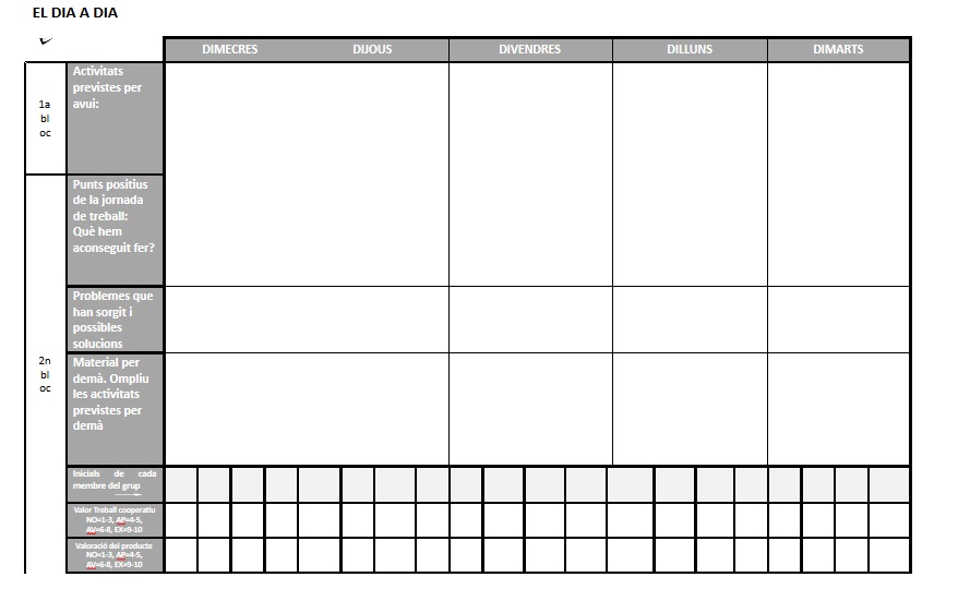 • Graella de seguiment diari de cada grup (amb apartats individuals) – al dossier del grup – i pel professor – al drive del professor –