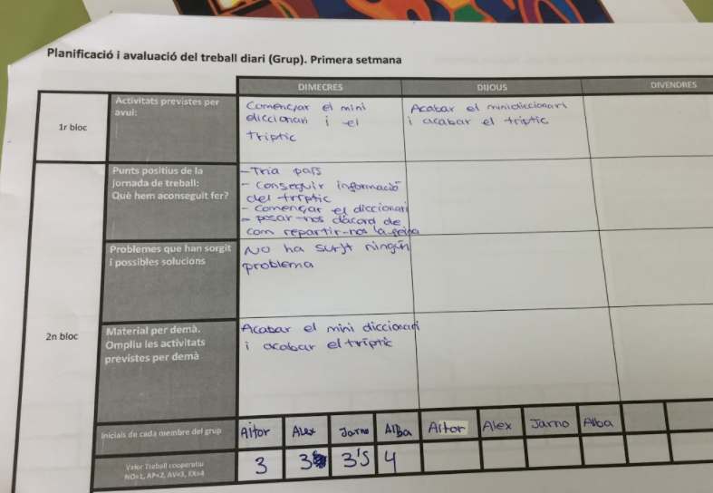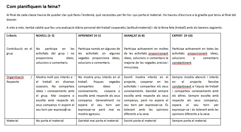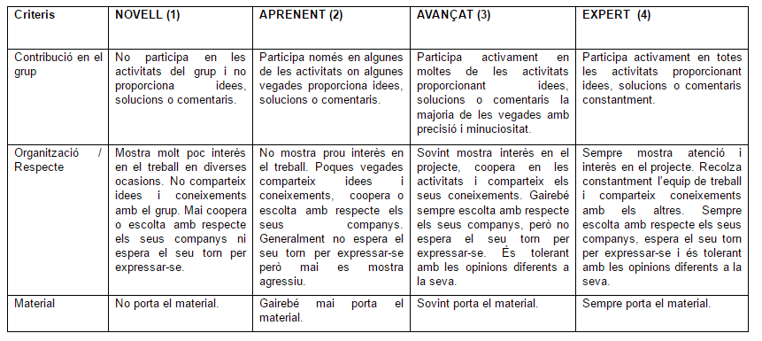 Un dels objectius del projecte és que els alumnes aprenguin a treballar cooperativament. A part d’explicar-los què vol dir, els facilitem una rúbrica per tal que s’avaluin diàriament