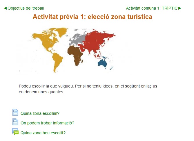 Per resoldre-ho hem creat una “activitat prèvia” al moodle que consisteix en aquesta elecció. Allà hi poden trobar una taula amb una proposta de diferents zones, i també alguns enllaços on buscar informació. Un cop ho tinguin clar, han de fer una entrada al fòrum explicant quina zona han triat i per què. Però prèviament a l’entrada, han de consultar les entrades anteriors i veure que cap altre grup ha triat ja aquesta zona. D’aquesta manera, aconseguirem que no hi hagi repeticions, per tal que la fira de l’últim dia sigui més rica i diversa. D’aquesta manera també potenciem que l’elecció sigui “àgil” (com abans entrin al fòrum, menys probabilitats hi haurà que un altre grup ja hagi triat aquella zona).
