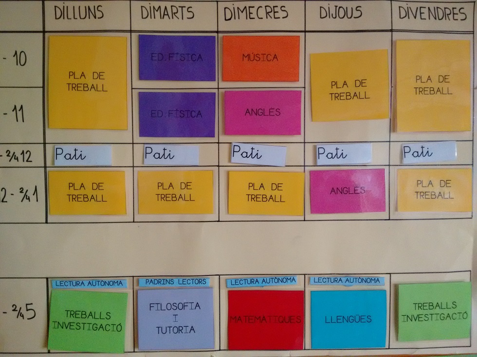 IMG_20170331_133049630 1– La voluntat com a centre de treballar de manera globalitzada les àrees. Per tant s’ha fet un primer pas de canvi, elaborant una distribució del temps en l’horari escolar, a tots els nivells, sense compartiments entre àrees majoritàriament.