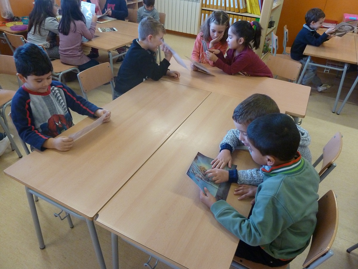 També hi havia activitats que es portaven a terme amb tot el grup alhora, però on cada grup de 6 alumnes  era autònom. Un exemple n’és aquesta imatge  en la qual es veu com tenen obres, les observen i després han de triar quin títol posarien  a cadascuna i raonar-ho.