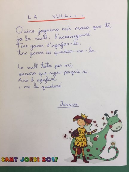 Partint de tot el que havíem estat portant a terme al llarg dels dos primers trimestres i de totes les converses que s’havien anat generant, vam aprofitar la diada de Sant Jordi per elaborar petits escrits sobre les emocions que van exposar-se al vestíbul de l’Ajuntament perquè les famílies i la gent del poble poguessin gaudir-ne durant la diada i la setmanes que la van succeir.