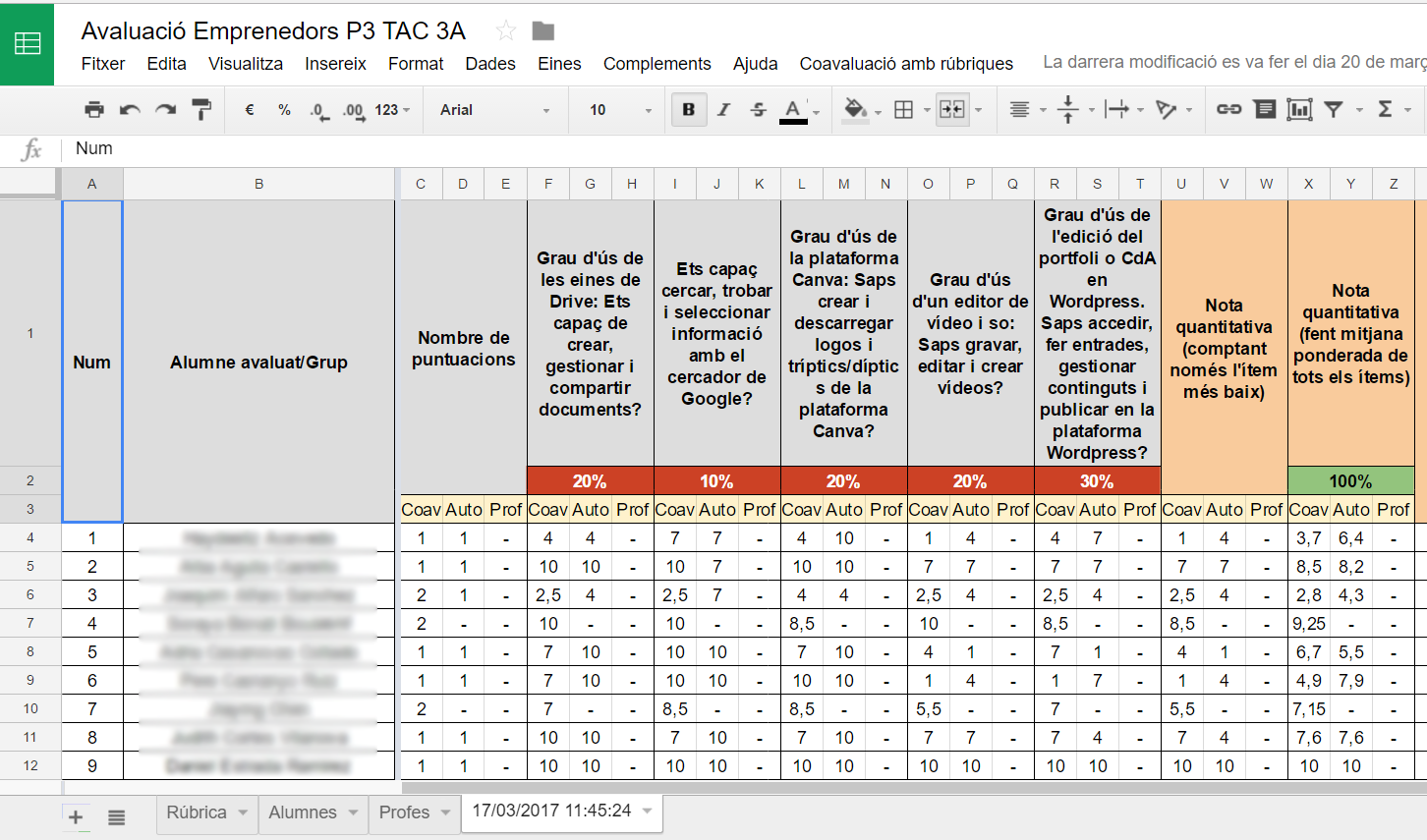 En aquest projecte hem implementat amb èxit l’ús de CoRubrics de Jaume Feliu. Aquesta eina basa el seu funcionament en els formularis i fulls de càlcul de Google i ens ha permés fer avaluació (de profe), l’autoavaluació i coavaluació en un mateix formulari.
