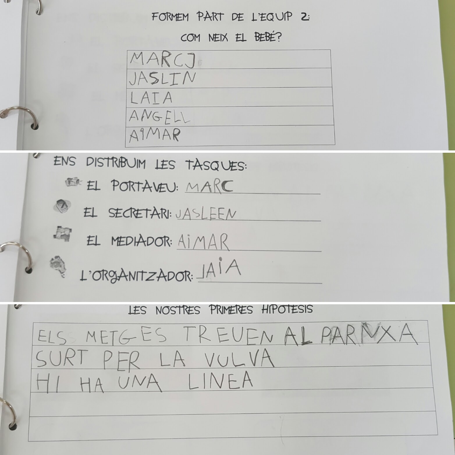Les primeres sensacions rebudes per part dels alumnes són molt positives. Aquesta primera sessió l’hem dedicat a esbrinar que saben ells de l’embaràs, han creat les seves primeres hipòtesis i a partir d’elles hem creat els diversos grups de treball per iniciar la cerca d’informació.