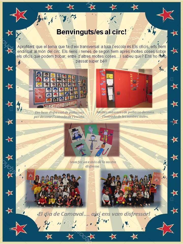 Oficis com… malabaristes, trapezistes, pallassos/es, director/a de circ. I fins i tot van sorgir oficis que han desaparegut, com l’Home Bala i el Forçut. D’aquesta manera vam relacionar el tema de l’àrea de medi social sobre el Pas del temps i comparar l’evolució  del circ des dels seus inicis fins el dia d’avui.