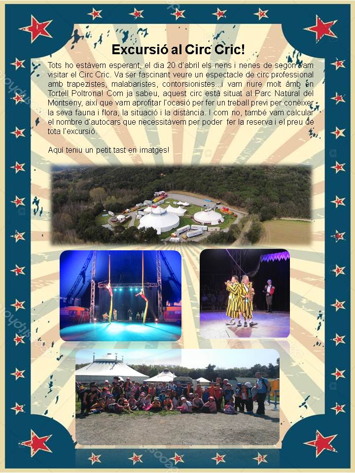 Des d’un principi no vam fixar una temporització perquè als inicis del projecte, les famílies i alumnes no estaven molt implicades. És per això que vam haver de reconduir la nostra programació i fixar com a fil conductor la sortida que faríem al Circ Cric a principis del tercer trimestre. Les activitats es van programar al voltant d’aquesta sortida. Activitats molt més reals i properes als infants.