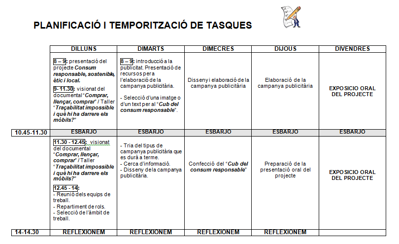 Per bé que els alumnes poden organitzar-se el temps com volen per anar realitzant les diferents activitats d’aula, al llarg de la setmana tenen un seguit d’activitats prefixades. És per això que  el primer dia se’ls entrega un  horari on poden veure quines activitats s’han previst i on poden trobar una proposta de programació (tasques per dia i hora) que els pot servir de guia per organitzar-se.