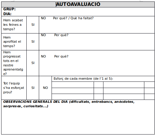 Al final del projecte es va realitzar una avaluació i una autoavaluació. Cadascuna consta dels següents punts: