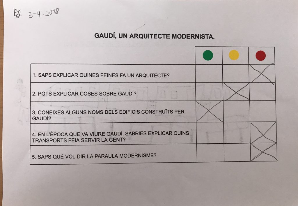 Com avaluació final vam fer el qüestionari KPSI i els hi vam demanar paraules que han après relacionades amb l’ofici d’arquitecte i amb Gaudí. La veritat és que la majoria ho va fer molt bé i han escrit moltes paraules més que al principi. També es va fer una altra activitat d’avaluació que consistia en posar el nom xxxxxx